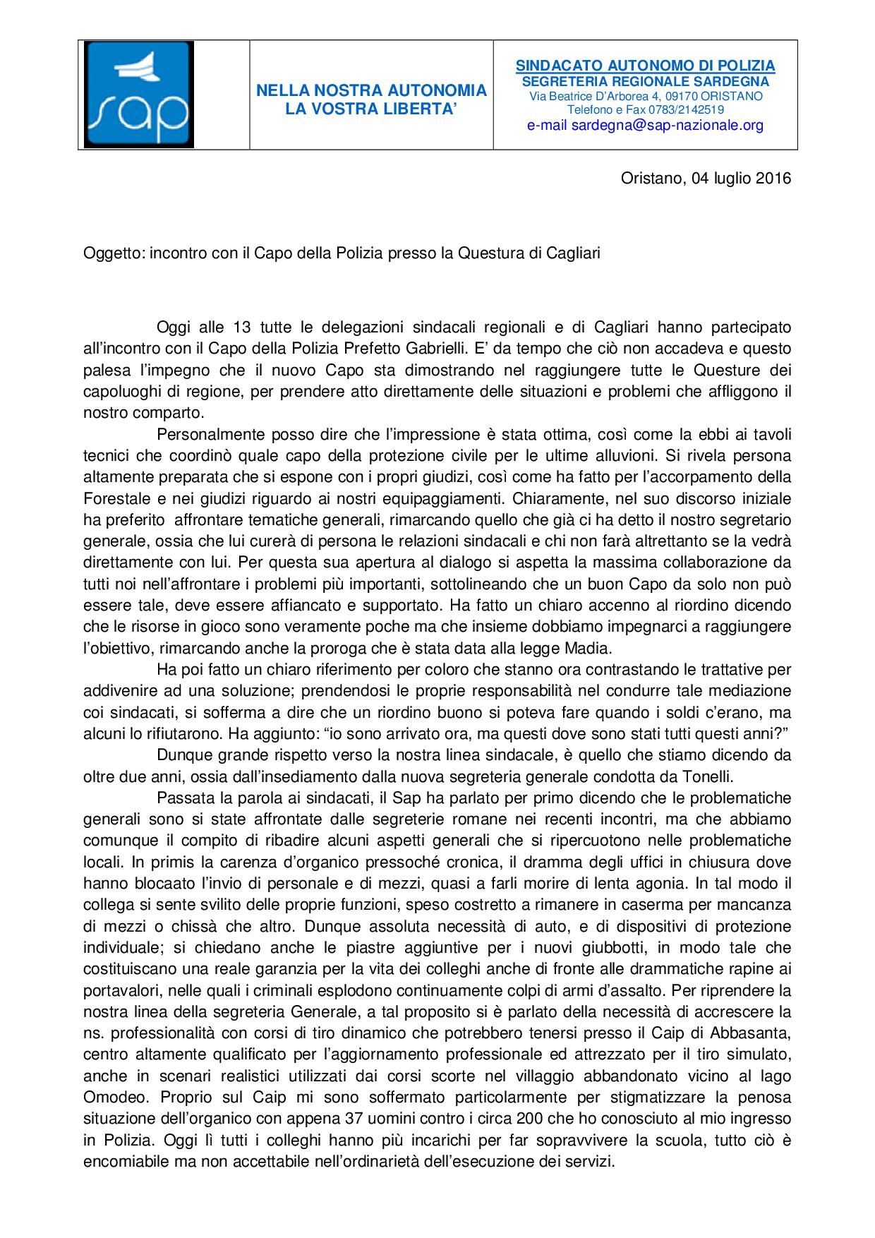 In data 4 luglio u.s., presso la Questura di Cagliari si è tenuto un vertice con il nuovo Capo della Polizia sua Eccellenza Prefetto Franco GABRIELLI. Il SAP Sardegna non poteva mancare. In prima fila ha preso per primo la parola con il Segretario Regionale Gian Cosimo MASALA che ha dettagliato la situazione di sofferenza e disaggio degli operatori sardi. Di seguito è intervenuto anche il Segretario di Cagliari Luca AGATI.